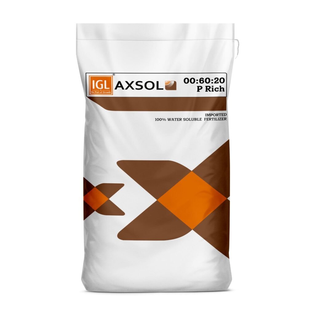 IGL AXSOL P RICH 00:60:20 is a high-phosphorus, low-nitrogen fertilizer known for its solubility, ease of use, and effectiveness in promoting early plant growth and increasing crop yield. It is important in agronomy for its role as a starter fertilizer and its compatibility with multiple application methods in modern agriculture.